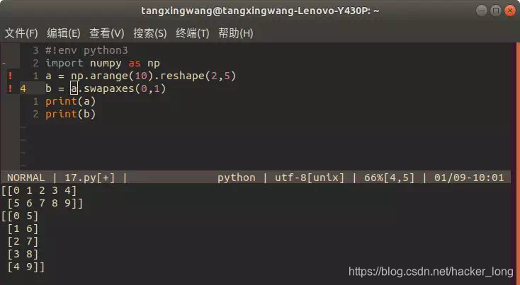 通过上面实例我们看出通过swapaxes()将一个数组的第0轴和第1轴进行了交换,由2行5列变成了5列2行。这是二维数组的维度交换,我们再看一个三维数组的例子,如下: