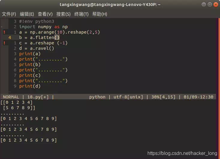 可以看出我们通过reshape(-1)、flatten()和ravel()函数将多维很容易就变成了1维数组。
