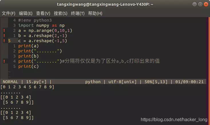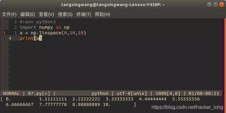在上面这个数组中,arange()的第一个值代表开始值,第二个值代表终值(不包括这个值),最后一个值代表步长(间隔),如arange(1,10,1)代表一个从0-9,步长为1的数组。这就是arange(),经常用的到!我们再看第二个方法linspace(),如下: