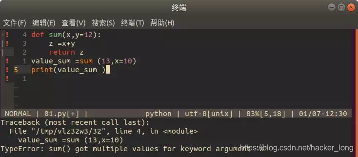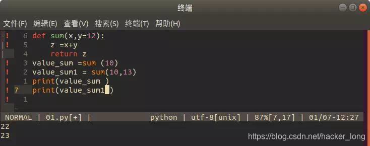 这个实例中,y = 12就是个默认参数,当该参数没有传入相应的值时,该参数就使用默认值。但有点需要注意:默认参数必须在位置参数后面,否则会报错。