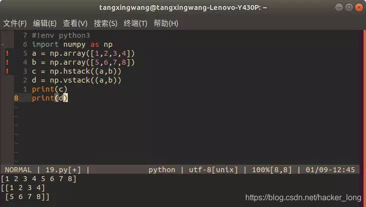 我们再说一下数组的堆叠,这个也是经常会用的。数组的堆叠通常有水平叠加和垂直叠加,分别用到hstack()和vstack()函数,请看下面的实例: