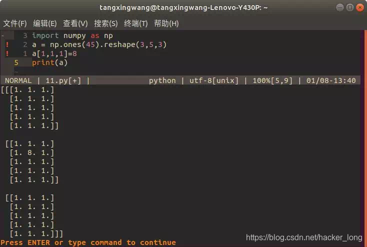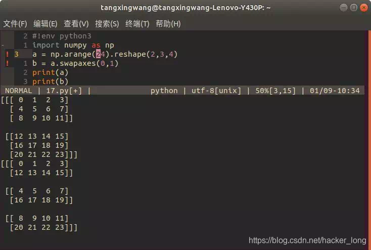 这个实例我将三维数组的第0轴和第1轴进行了交换,第0轴就是我在上面2.3存取数组这一节中说的块,第1轴就是块中的行,下面我将我对三维数组维度交换的理解和大家分享下。
