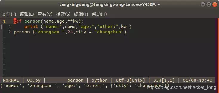 通过上面的例子你应该明白了关键字参数是什么了吧,实际上就是你传入的参数比你之前定义的参数会多,注意位置参数必须要给它传值。
