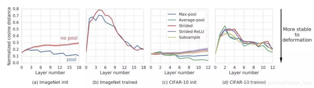 总之结论就是:看上面的4个图。(a) 刚开始的时候池化确实有利于提高抗变形能力。(b) 不管池化不池化,模型最后学习完都能获得同样的抗变形能力。(c) 初始化的时候不同的池化方法是有差异的。(d) 学习完之后不管什么池化方法效果都差不多。