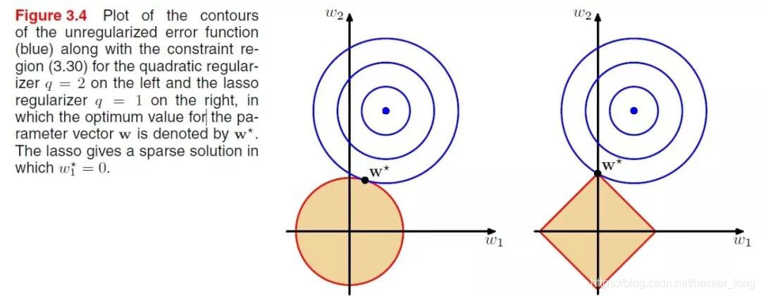 这么来看上面的那张图,参数空间(w1,w2)是一个二维平面,蓝色部分是一个平方损失函数,黄色部分是正则项。
