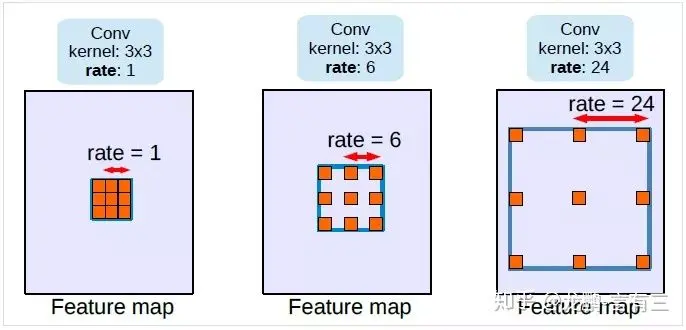 下图是空洞卷积结构的示意图,从左到右比率(rate)分别为1、6和24,比率可以粗暴理解为卷积核内相邻两个权重之间的距离。从图中可以看出,当比率为1的时候,空洞卷积退化为常见的卷积。
