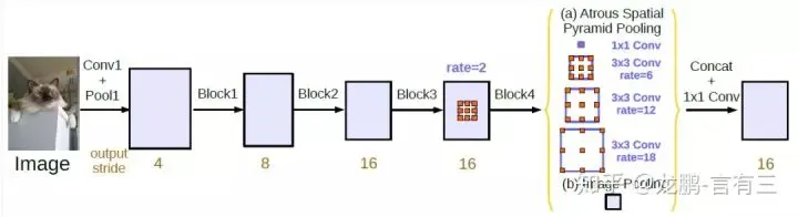 下图是基于最后一种结构的空洞卷积网络结构,也称为ASPP(Atrous Spatial Pyramid Pooling),也是前两个DeepLab版本中所使用的网络结构。