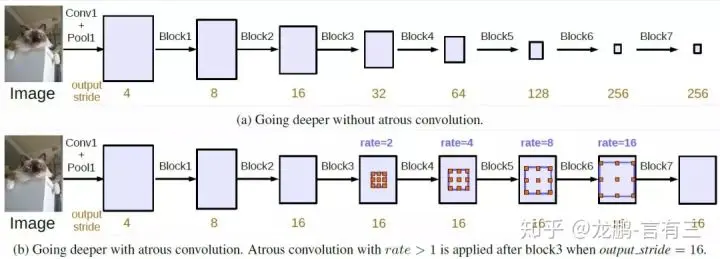 除了维持空间分辨率,空洞卷积也可以像标准卷积一样通过设置输出步长(output_stride)实现输出特征图分辨率的控制。