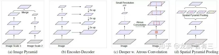 在图像分割领域中,主要存在下面四种网络结构能够实现多尺度上下文的获取。从左到右分别是金字塔结构、编解码结构、空洞卷积结构和空间金字塔池化结构。