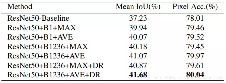 为了验证金字塔结构的有效性,PSPNet的作者对其进行了一系列的剥离实验。具体结果如下表所示: