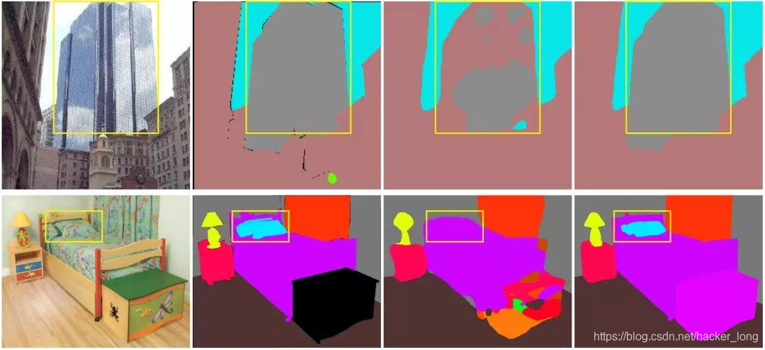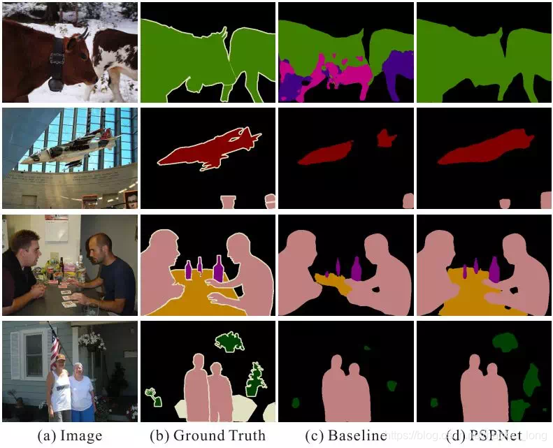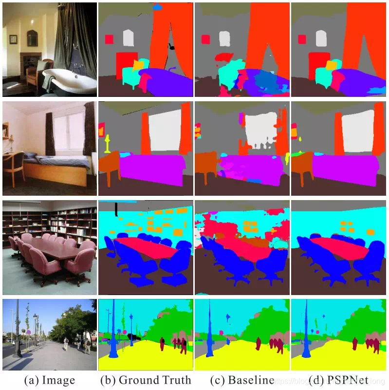 从左到右分别为:图像、真值、FCN结果和PSPNet结果。