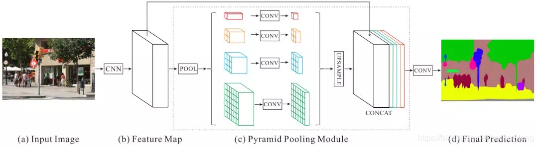 最终得到的特征尺寸是原始图像的1/8。最后在通过卷积将池化得到的所有上下文信息整合,生成最终的分割结果。
