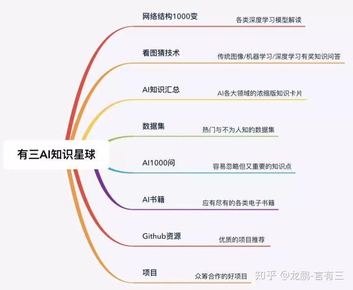 有三AI知识星球由言有三维护,内设AI知识汇总,AI书籍,网络结构,看图猜技术,数据集,项目开发,Github推荐,AI1000问八大学习板块。