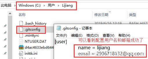 查看用户名和邮箱是否配置成功,去这个路径:C:\Users\Lijiang,找到.gitconfig文件并打开,如果有下面这些内容就说明成功了
