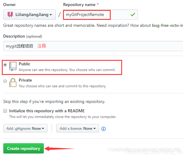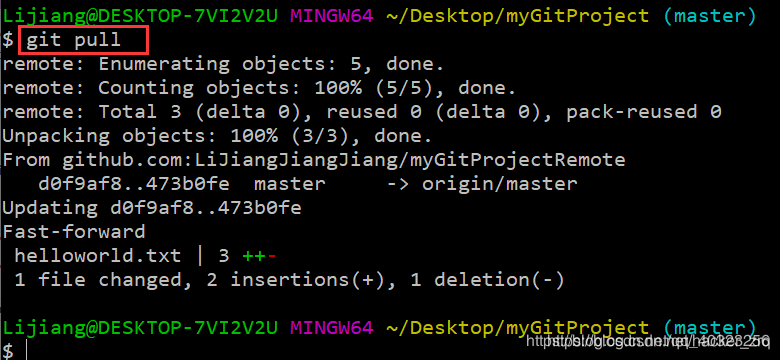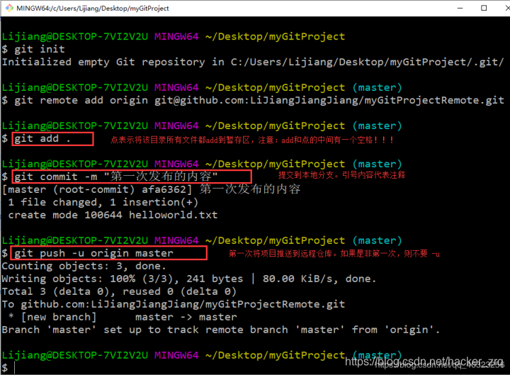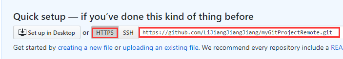 输入命令:git remote add origin git@github.com:LiJiangJiangJiang/myGitProjectRemote.git 注意:橘黄色的是远程项目的唯一标识符 ,(origin后面那一大串子直接复制那个ssh的内容就行。)