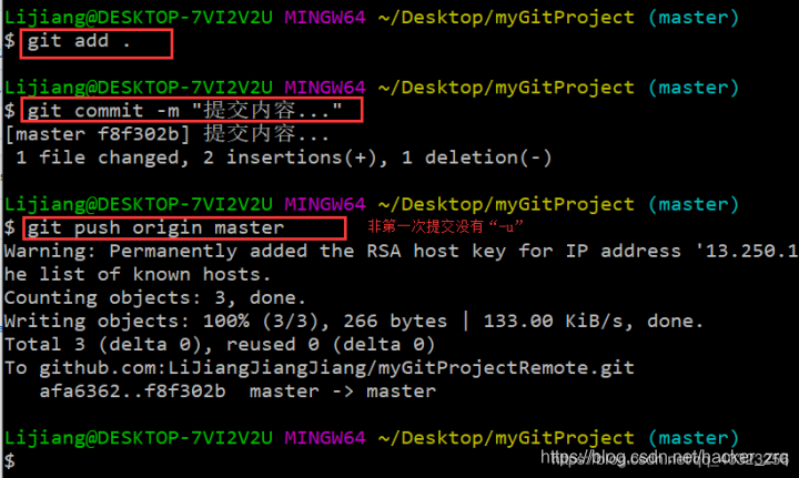 git push origin master (注意:这是非第一次提交,所以没有“-u”)