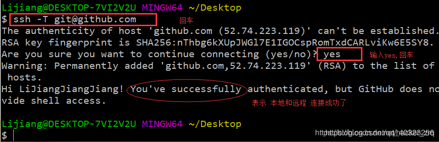 测试连通性,看本地仓库和远程仓库是否连接成功,输入命令:ssh -T git@github.com