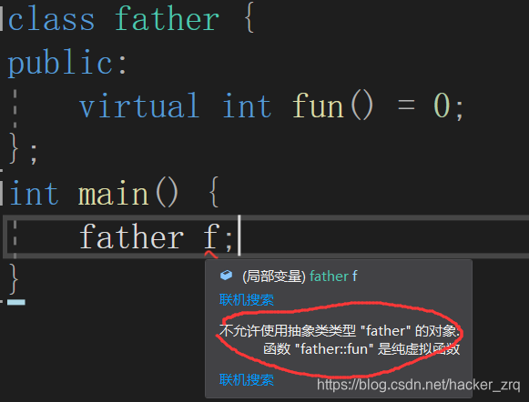 抽象类无法实例化对象,但是可以通过指针和引用(比如父类指针指向子类对象),就可以指向并访问相应派生类的对象。如下图所示: