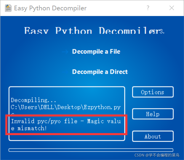 正当我满心欢喜,把.pyc文件拖入的时候却显示了错误。Invalid pyc/pyo file - Magic value mismatch!