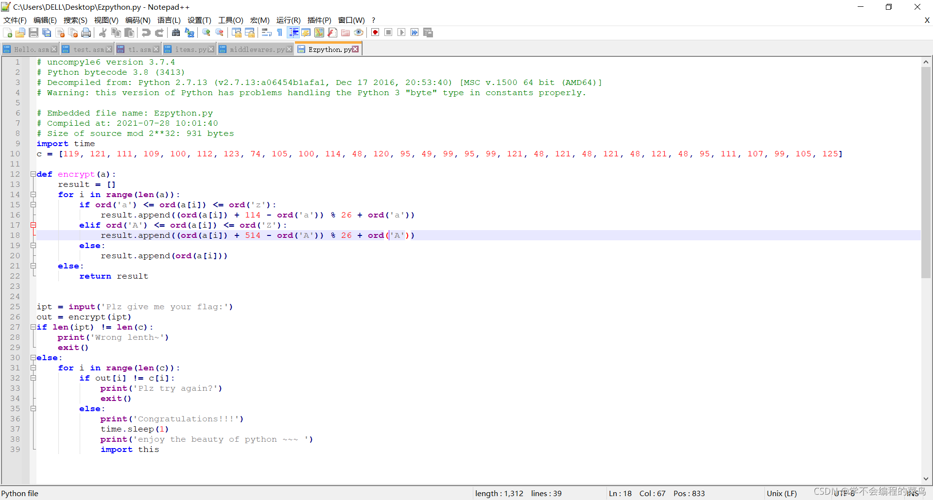 用notepad++打开,终于发现了熟悉的python代码。热泪纵横!绕了一大圈仔=子,最终可算回到了正道上。接下来就是找flag,flag倒是很好找。