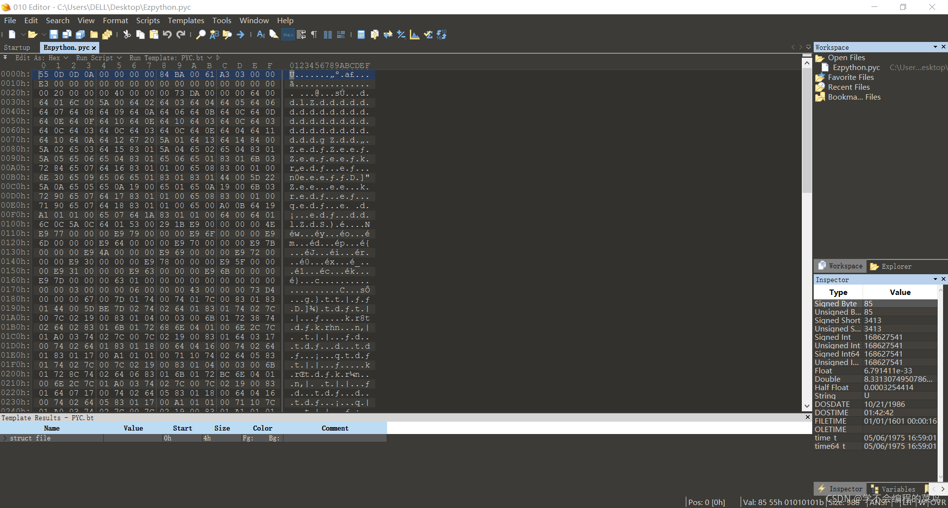 那既然要补齐,起码得先打开这个十六进制文件,但是我用记事本、notepad++都打不开,于是我有搜索发现010 Editor可以用来干这个事情。然后又是一通搜教程下载。 费好大劲可算是配置好了。然后用它打开.pyc文件,想着马上就成功了,然后开始手动补齐吧。