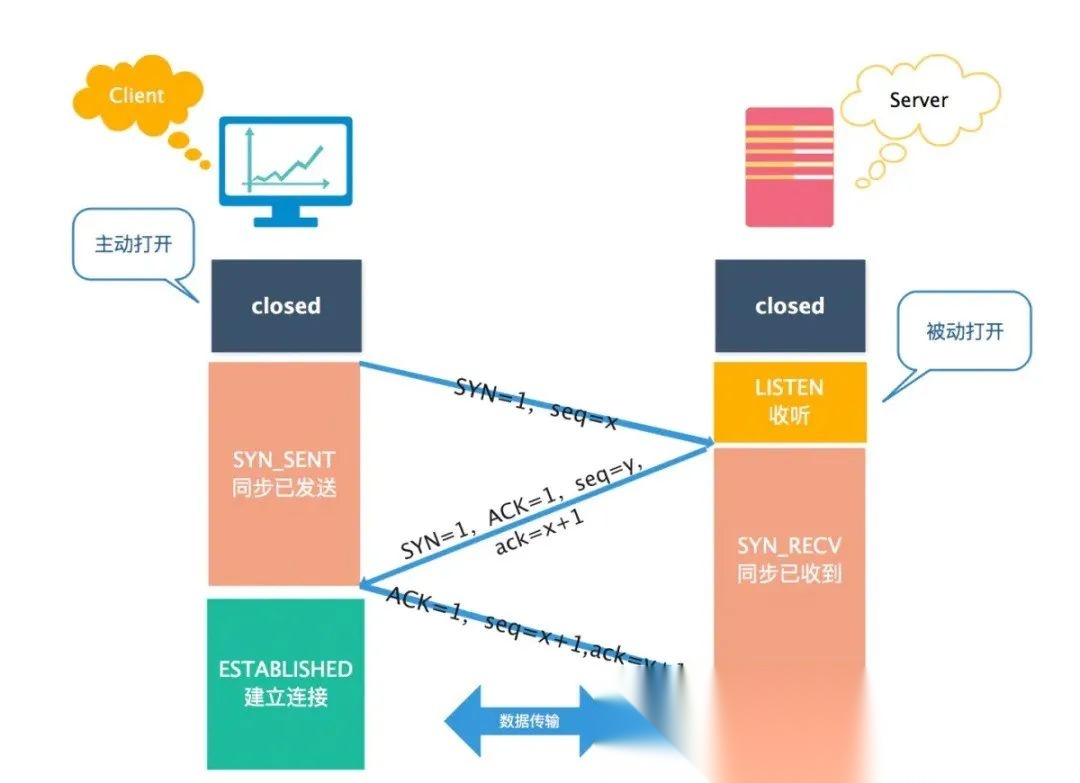 第一次握手:建立连接时,客户端发送 syn 包(syn=j)到服务器,并进入 SYN_SEND 状态,等待服务器确认;