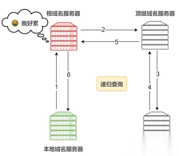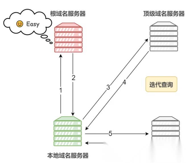 本地域名服务器向根域名服务器的查询的迭代查询。