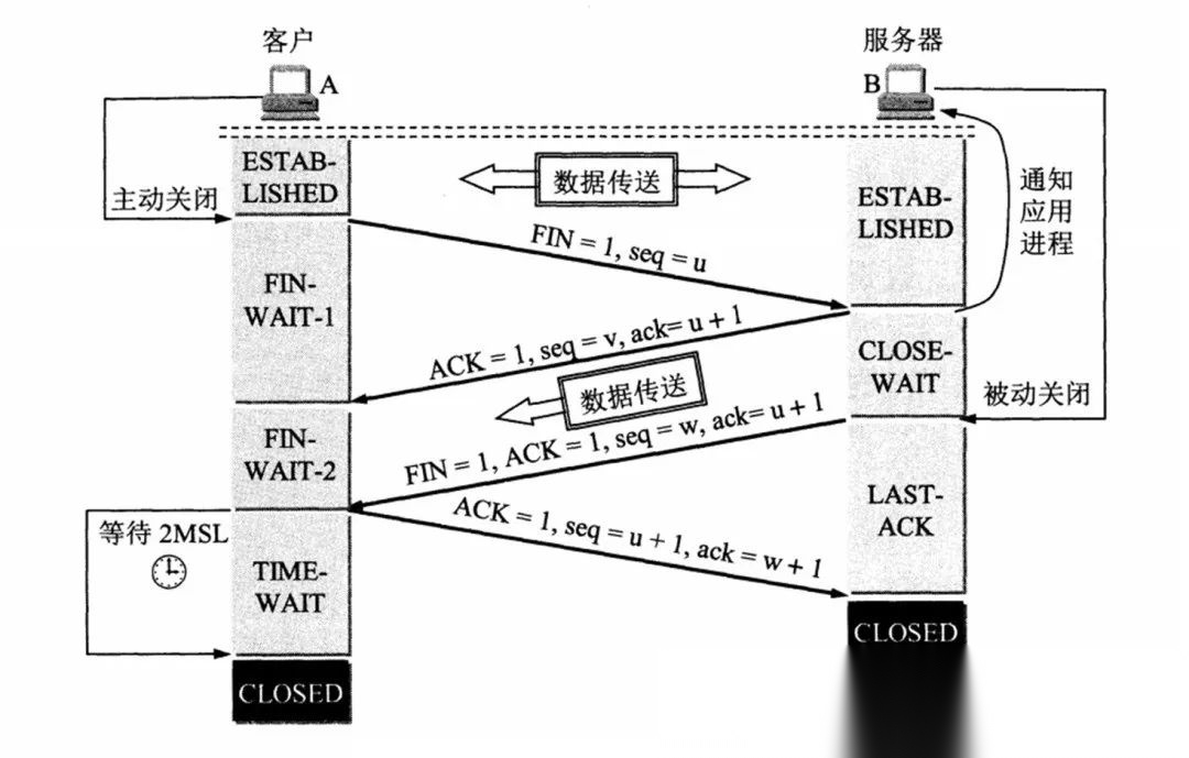 第四次挥手:主动关闭方收到 FIN 后,发送一个 ACK 给被动关闭方,确认序号为收到序号+1,至此,完成四次挥手。