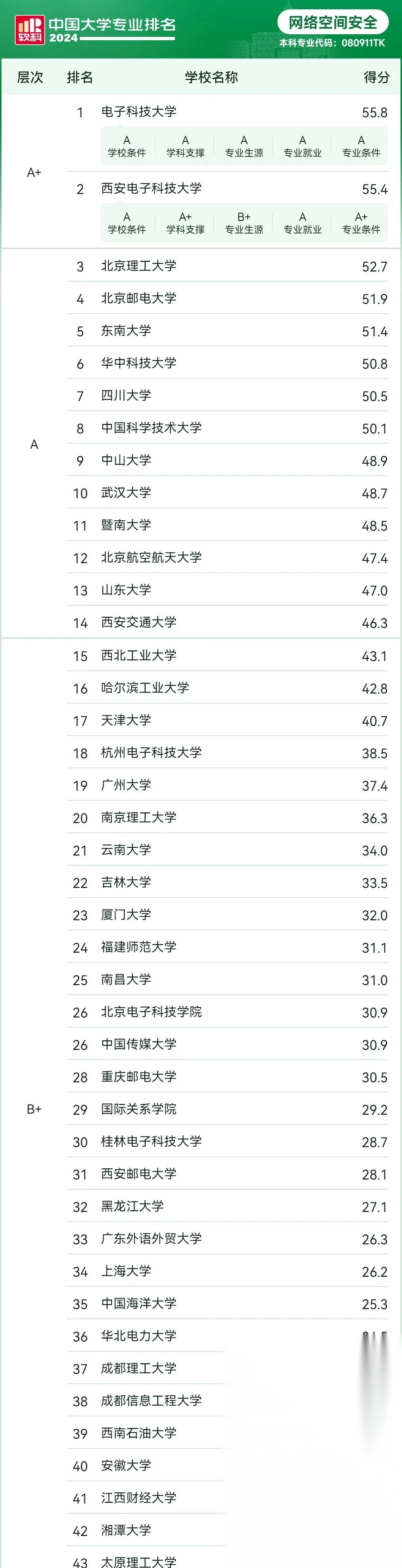 2024年软科最好学科排名,网络空间安全专业层次为A+、A、B的院校如下: