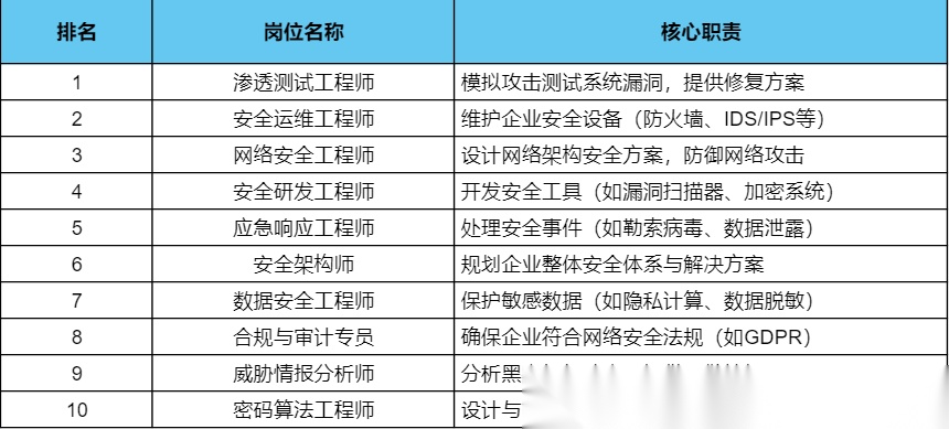 **安全管理类:**网络安全架构师、信息安全经理、合规审计师等。