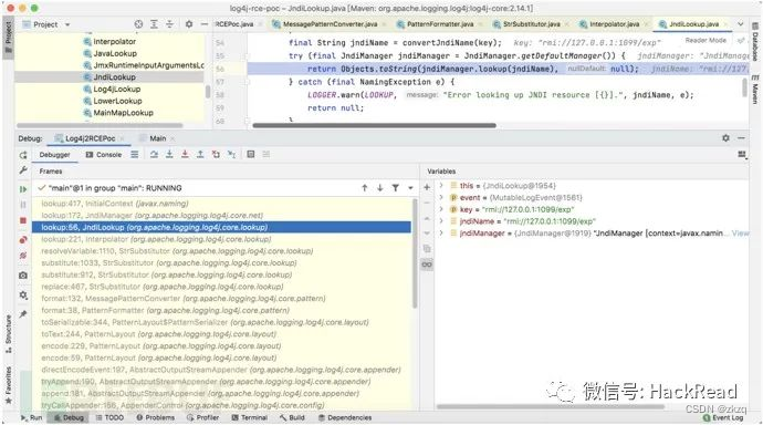 例如对poc例子中的jndi:rmi://127.0.0.1:1099/exp解析后得到jndi的Lookup功能实现类为JndiLookup,并调用JndiLookup.lookup()方法。