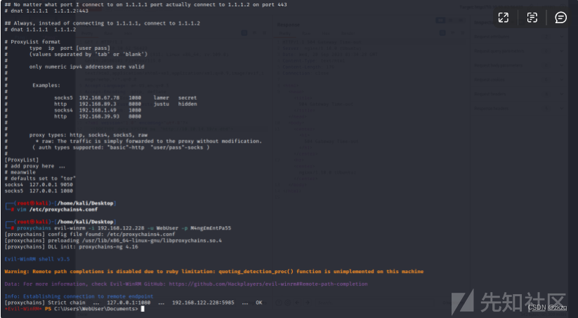 然后在kali里面配置prtoychains,然后进行连接测试。