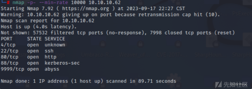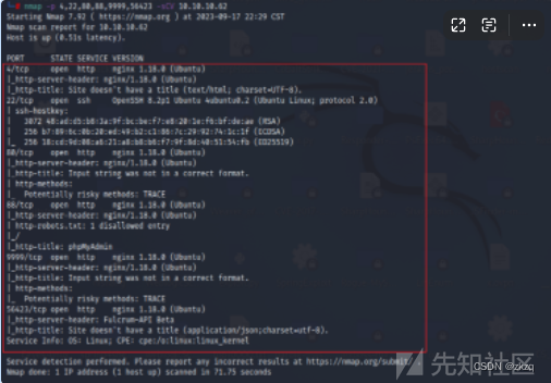 使用nmap进行端口扫描,发现存在大量端口开放。