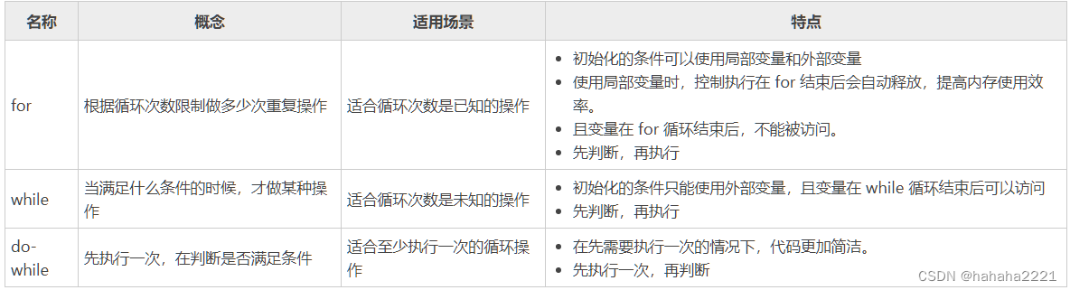 执行顺序不同,for、while先判断后执行do while先执行后判断