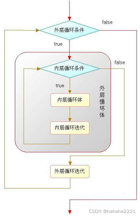 当内层循环执行结束,且外层循环的循环体执行结束时,则再次计算外层循环的循环条件,决定是否再次开始执行外层循环的循环体