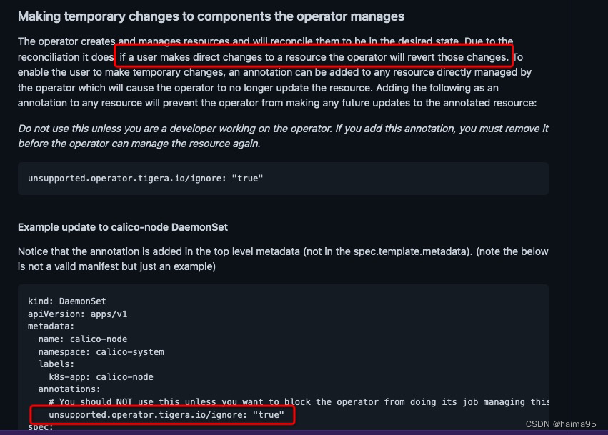 要先在daemonset里添加unsupported.operator.tigera.io/ignore: "true",再执行修改,修改成功后再去掉这条unsupported.operator.tigera.io/ignore: "true"。