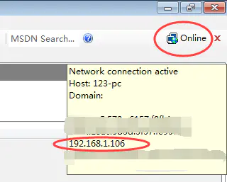- 电脑ip地址可通过cmd命令行输入ipconfig查询,或网络连接信息中找到,最直观的方法是将鼠标置于fiddler右上角的online中即可显示电脑的ip地址。如下图我的IP是192.168.1.106。
