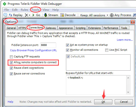 如果想要捕获手机上的通信数据,就需要手机连接上Fiddler代理,而Fiddler默认是不允许其他设备进行连接的,解决办法:点击 Fiddler->Tools -> Options,在 Connections 面板选中 Allow remote computers to connect 允许其他设备连接(此操作需重启Fiddler生效)。