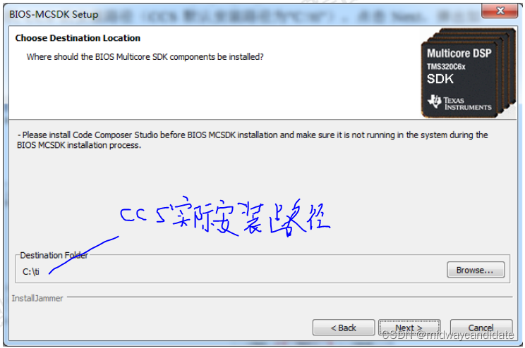 (2.5)路径时规则同上,应选择CCS的实际安装路径。比如如果安装CCS时未做改动,那么实际安装路径应该是C:\ti\ccs1011。之后点击NEXT。