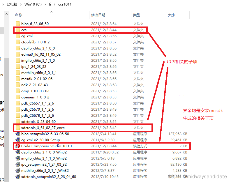 (2.7)经以上操作,就完成了mcsdk的安装。安装完成之后安装路径文件夹如下图所示。安装mcsdk生成的相关文件和文件夹与CCS文件夹都位于C:\ti\ccs1011路径之下。