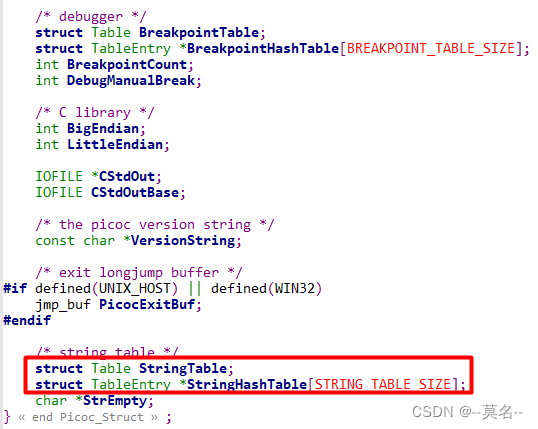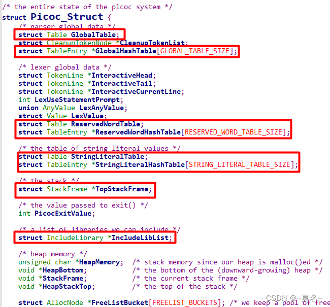 这个结构比较大,内容也比较多,这里只挑重要的截了两张图。主要需要注意的就是上面图中红框圈出的结构,整个picoc编译器就是依靠这些结构组织起来的,大部分的操作也是围绕着这些结构展开的。初始化流程中会这些结果的功能做介绍,这里先不介绍了。