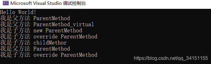 static void Main(string[] args) { Console.WriteLine("Hello World!"); //多态 子类能替代父类表现出不同的行为: 在继承关系中,一个类被实例化被其子类替代,子类中有父类的虚方法重写 //将表现出子类的方法的行为;子类若有没有其父类虚方法的重写,将表现出父类方法的行为。 { //按实例化及继承关系正常访问, Parent p = new Parent(); p.ParentMethod(); p.ParentMethod_virtual(); child c = new child(); c.ParentMethod(); c.ParentMethod_virtual(); c.ChildMethor(); } //子类替代父类 Parent pc = new child(); pc.ParentMethod();// 1、访问父类原ParentMethod方法,忽略子类的new出来的 pc.ParentMethod_virtual(); //2 、访问子类重写父类的虚方法;子类中未对父类虚方法的重写将访问父类的方法。 //pc.ChildMethor(); //无法访问子类独有公用方法 } public class Parent { public void ParentMethod() { Console.WriteLine("我是父方法 ParentMethod"); } public virtual void ParentMethod_virtual() { Console.WriteLine("我是父方法 ParentMethod_virtual"); } } public class child : Parent { public new void ParentMethod() { Console.WriteLine("我是子方法 new ParentMethod"); } public override void ParentMethod_virtual() { Console.WriteLine("我是子方法 override ParentMethod"); } public void ChildMethor() { Console.WriteLine("我是子方法 childMethor"); } } - 运行结果