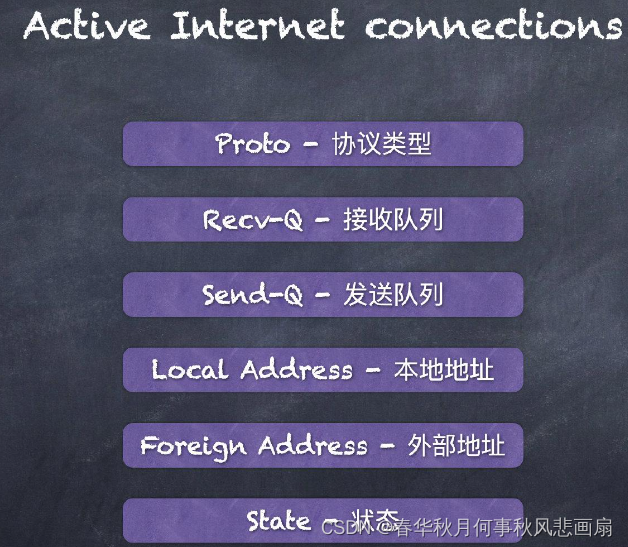从整体上来看,netstst 的输出结果可以分为两部分,一部分是 Active Internet connections,称为活跃 TCP 连接,其中的 Recv-Q 和 Send-Q 指的是客户端发送队列和客户端接收队列。这两个队列的值一般都是 0 ,如果不是 0 的话表示有消息堆积还没有发出去/取出,这种情况一般很少见到。