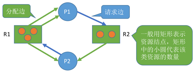 - 进程结点—>资源结点:表示进程想申请几个资源〔每条边代表一个)