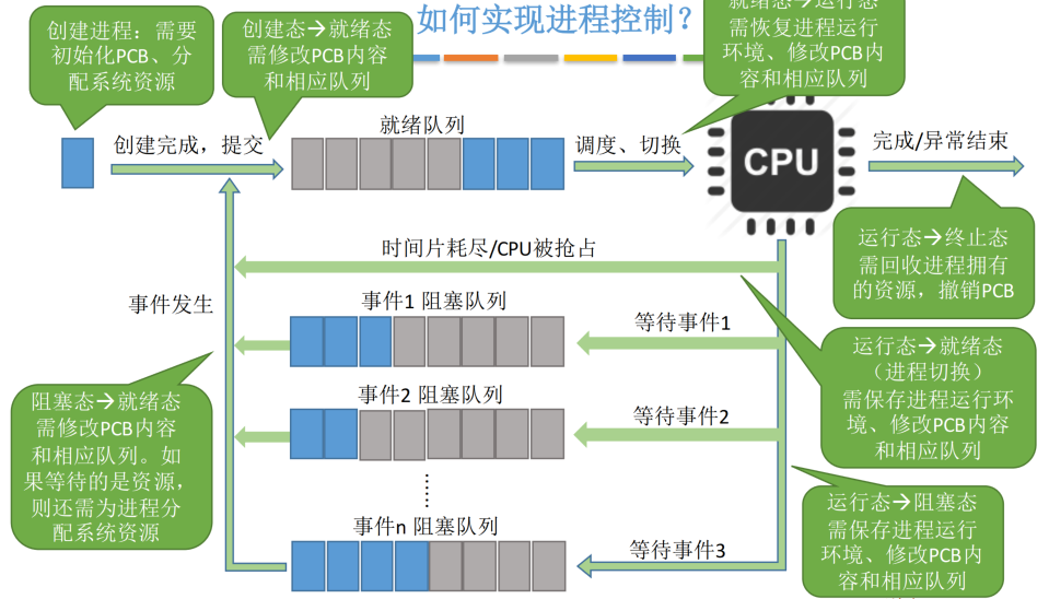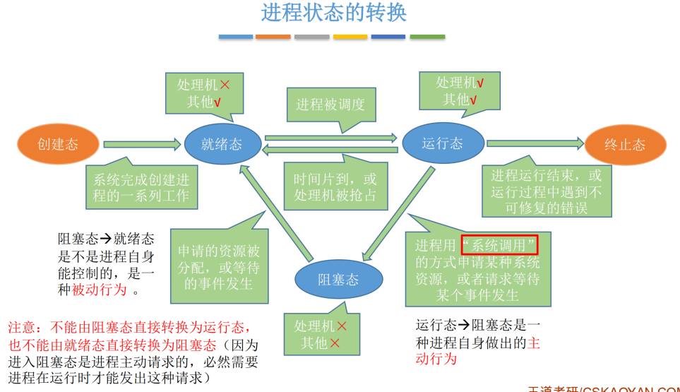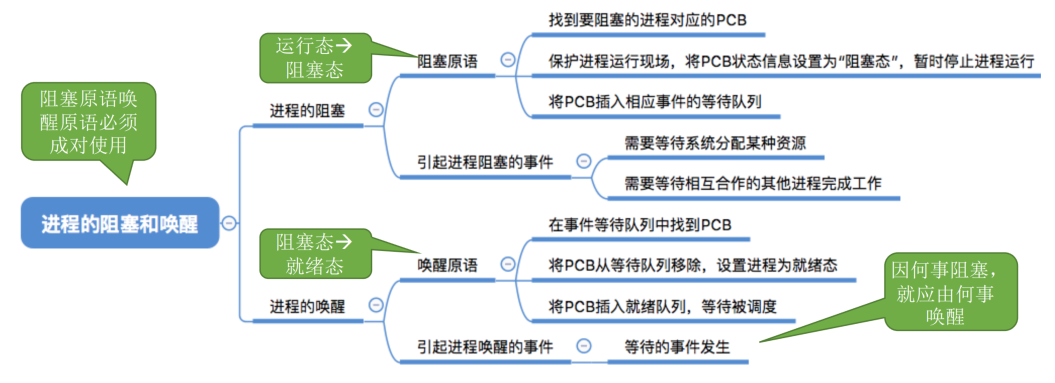 - 阻塞:等待某一事件而暂时不能运行。等待操作系统分配打印机、等待读磁盘操作的结果