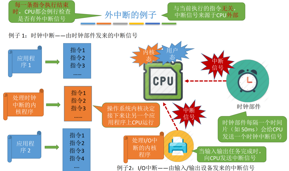 - 执行完每个程序之后,CPU都要检查当前是否有外部中断信号(如用户通过键盘输入了一个字符)