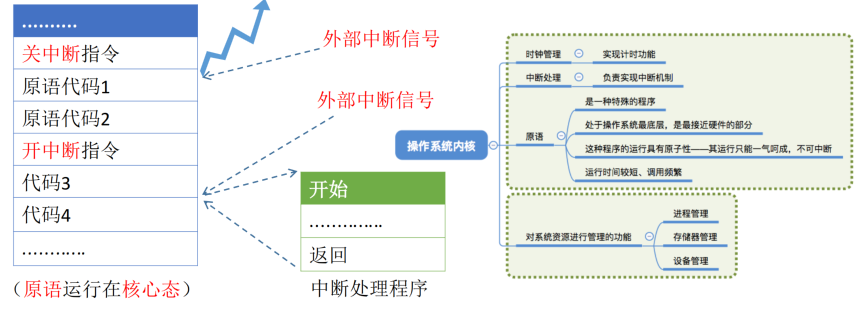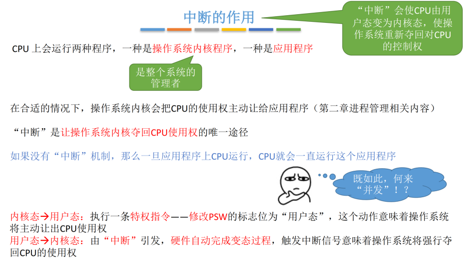 由于操作系统的管理工作(比如进程切换、分配I/O设备等)需要使用特权指令,因此CPU要从用户态转为核心态。中断可以使CPU从用户态切换为核心态,使操作系统获得计算机的控制权。有了中断,才能实现多道程序并发执行。