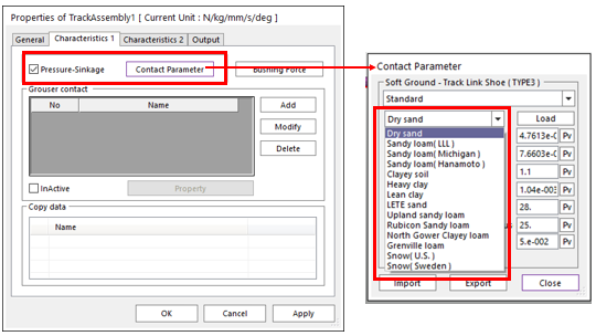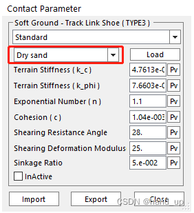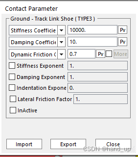 | Pressure-Sinkage压力下沉:如选定,地面和履带板之间的接触参数会随着土壤条件的变化而变化. Contact Parameter接触参数:定义地面和履带板之间的接触特征值。 | |