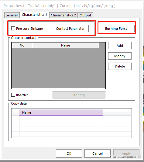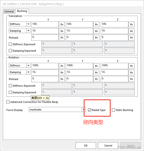 Bushing Force衬套力:定义要在两个连杆之间连接的特征值,设置履带刚度。